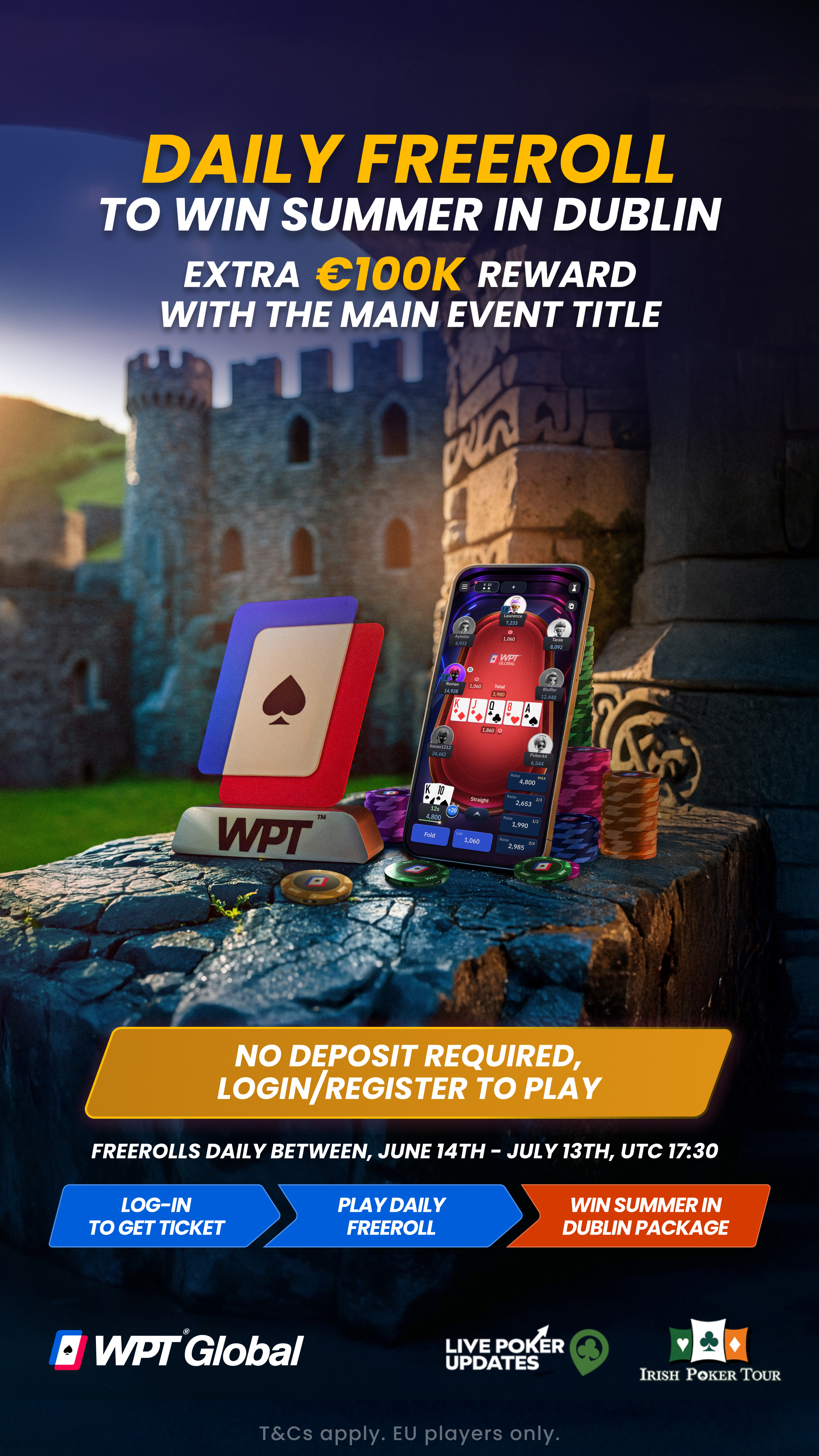 Want to play one of the hottest live poker events this summer for free? WPT Global makes it possible with its Summer in Dublin Feeder Freerolls promotion. From June 14 to July 13, join daily freerolls and win a €720 package that includes: