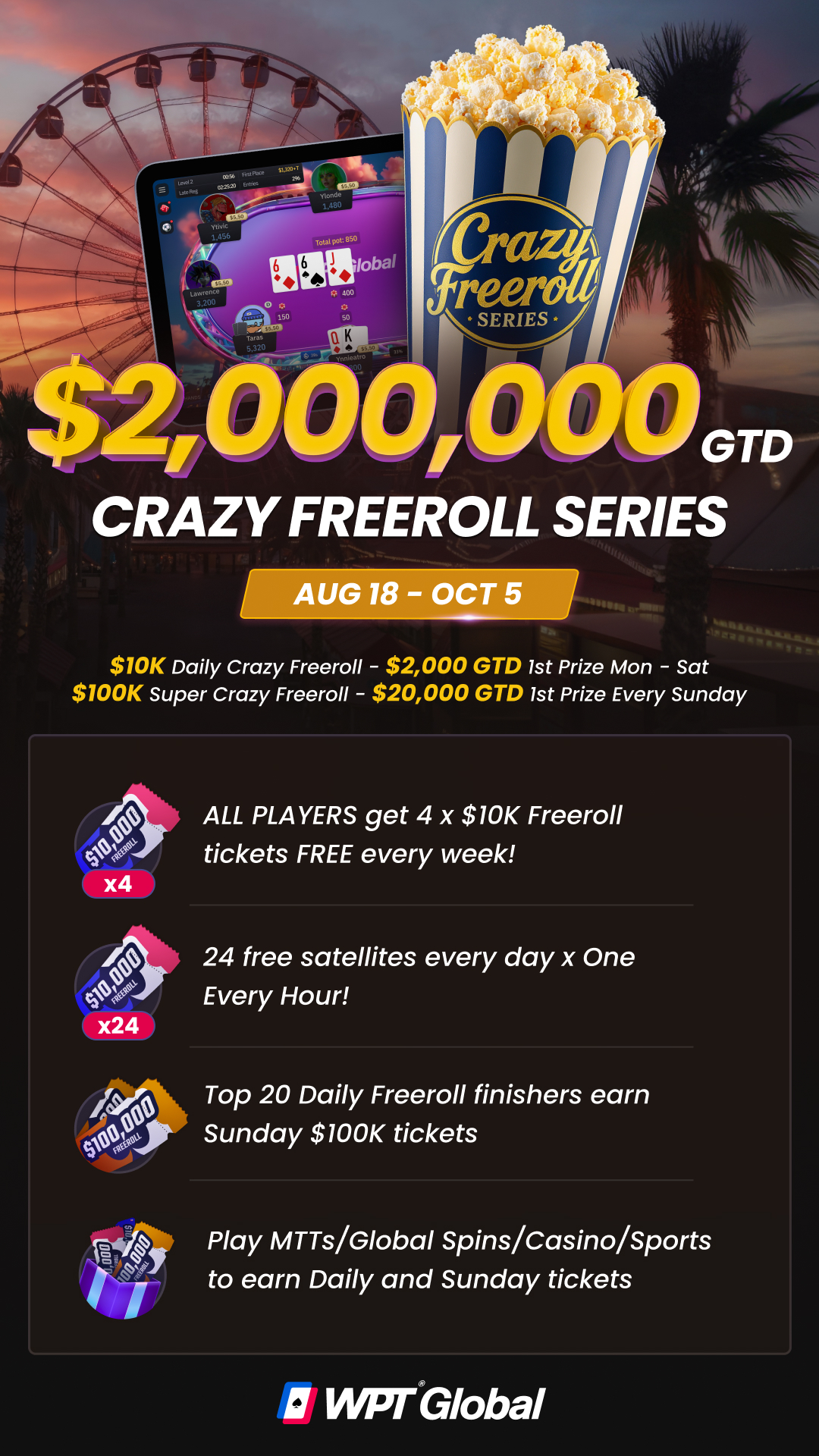 Download WPT Global, collect your tickets, and play the Crazy Freerolls for a shot at $2 million in prizes.