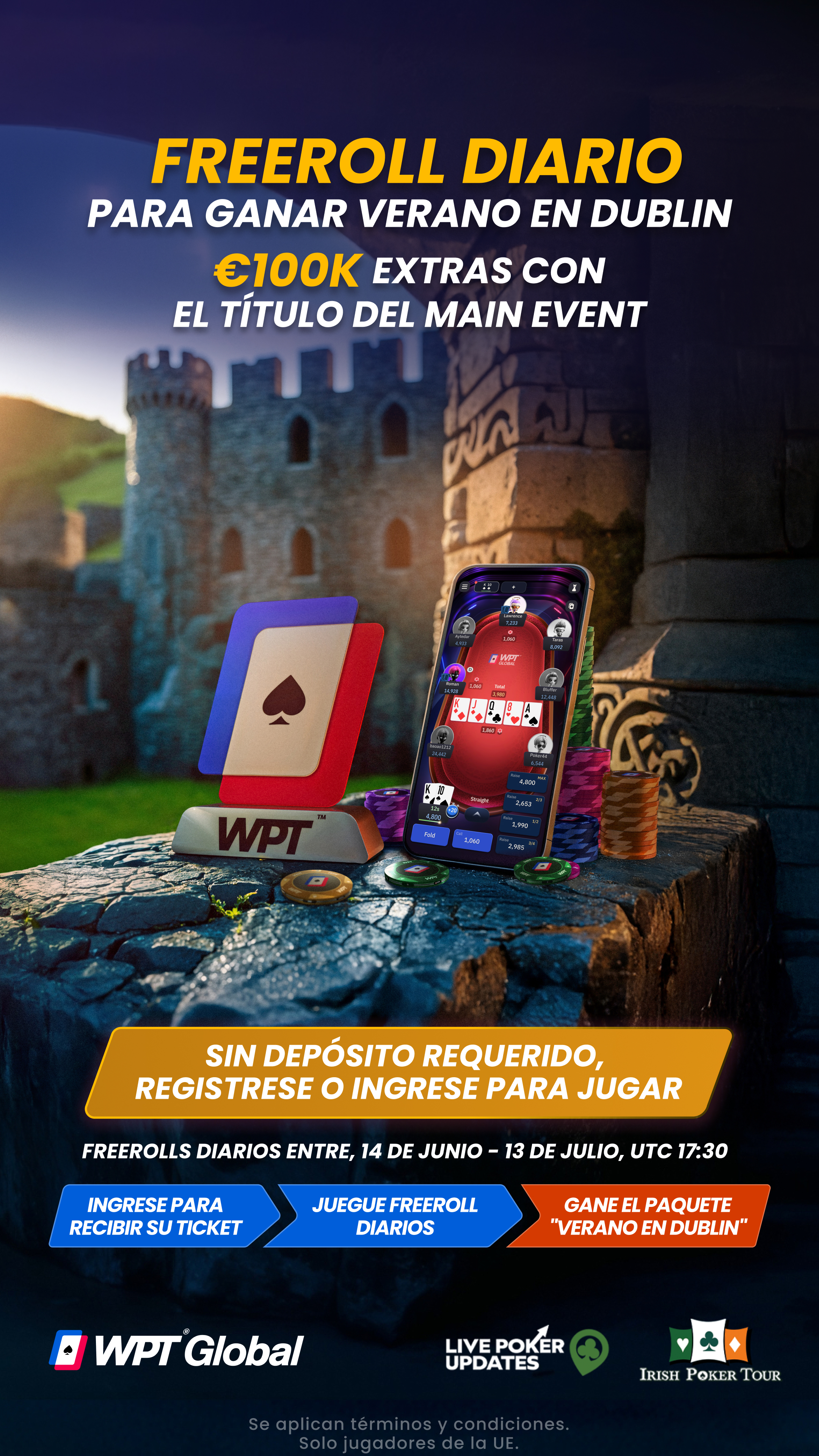 ¿Quieres jugar en uno de los eventos en vivo más importantes del verano sin gastar un euro? WPT Global te lo pone fácil con su promoción Summer in Dublin Feeder Freerolls. Desde el 14 de junio hasta el 13 de julio, participa cada noche en torneos gratuitos donde podrás ganar un paquete de €720, que incluye: