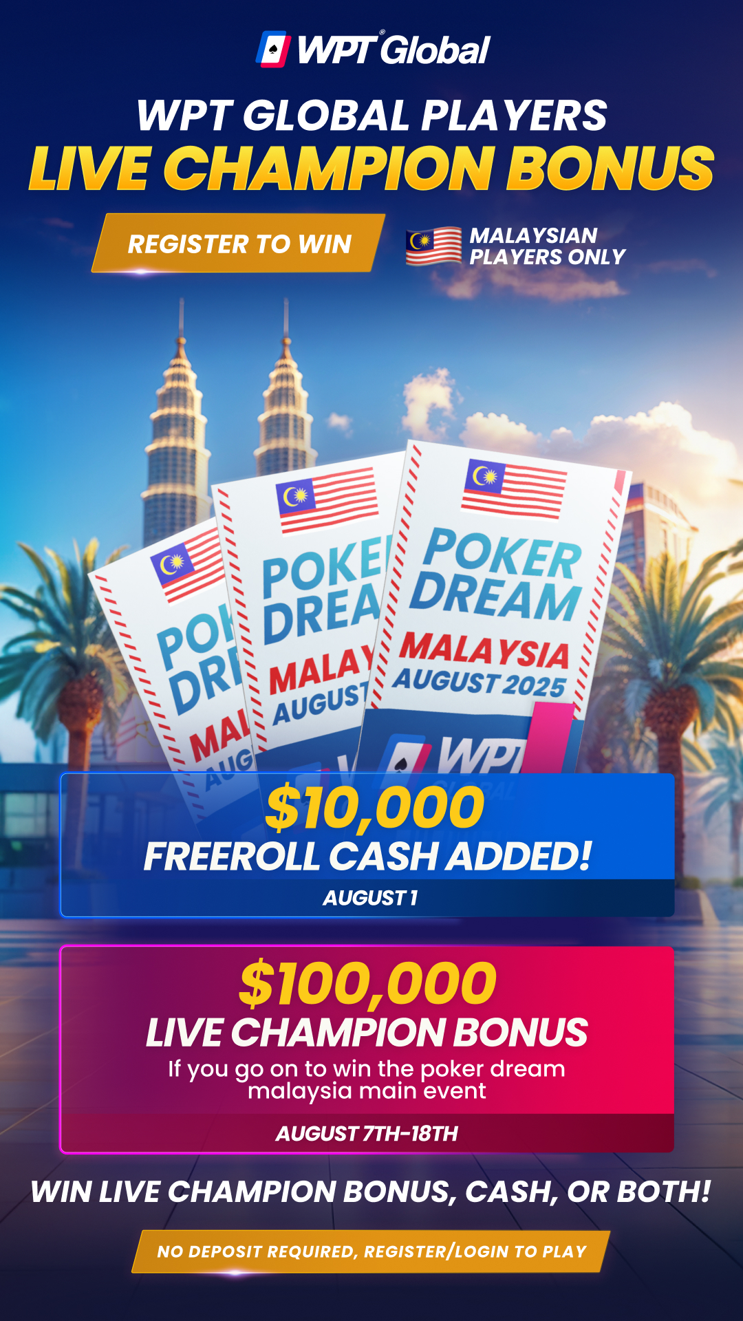 Si luego uno de estos ganadores logra el primer puesto en el Poker Dream Malaysia Main Event (7–18 agosto en Genting Highlands), se le otorgarán $100.000 adicionales en efectivo, cortesía de WPT Global.
