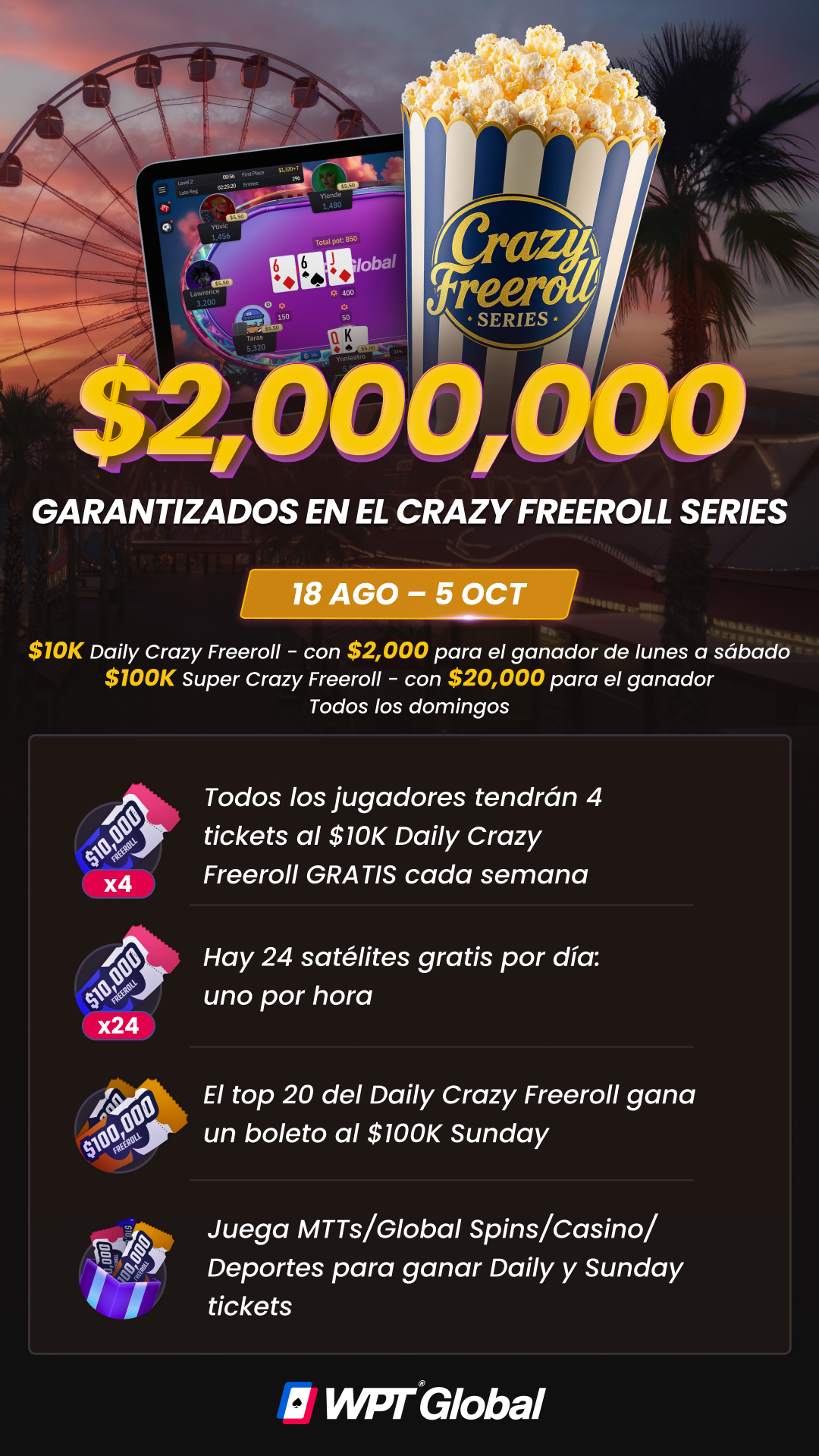 WPT Global enloquece este verano con sus Crazy Freerolls, una promoción que reparte más de $2 millones en premios sin costo de inscripción, activa del 18 de agosto al 5 de octubre de 2025.
